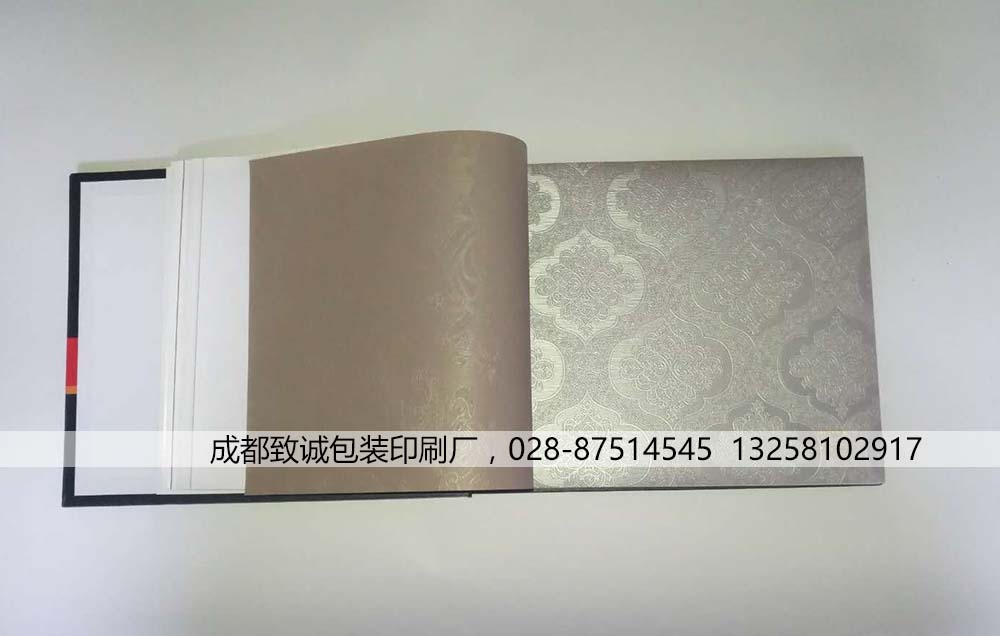 產(chǎn)品材質(zhì):封面3.0工業(yè)紙板,內(nèi)頁157g銅版,墻布樣品為客戶自行提供
